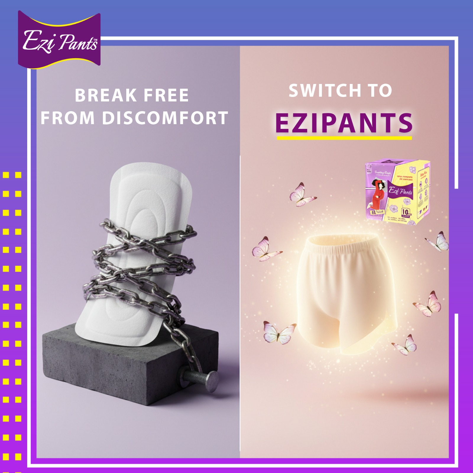 EziPants brings Pakistan its first-ever sanitary pant brand, designed to give women the freedom, confidence, and comfort they deserve. With 360° elastic fit, odor control, and up to 12-hour heavy flow protection, EziPants is your reliable partner for periods, postpartum recovery, and everyday freshness. Simply wear, tear, and dispose—no mess, no stress
