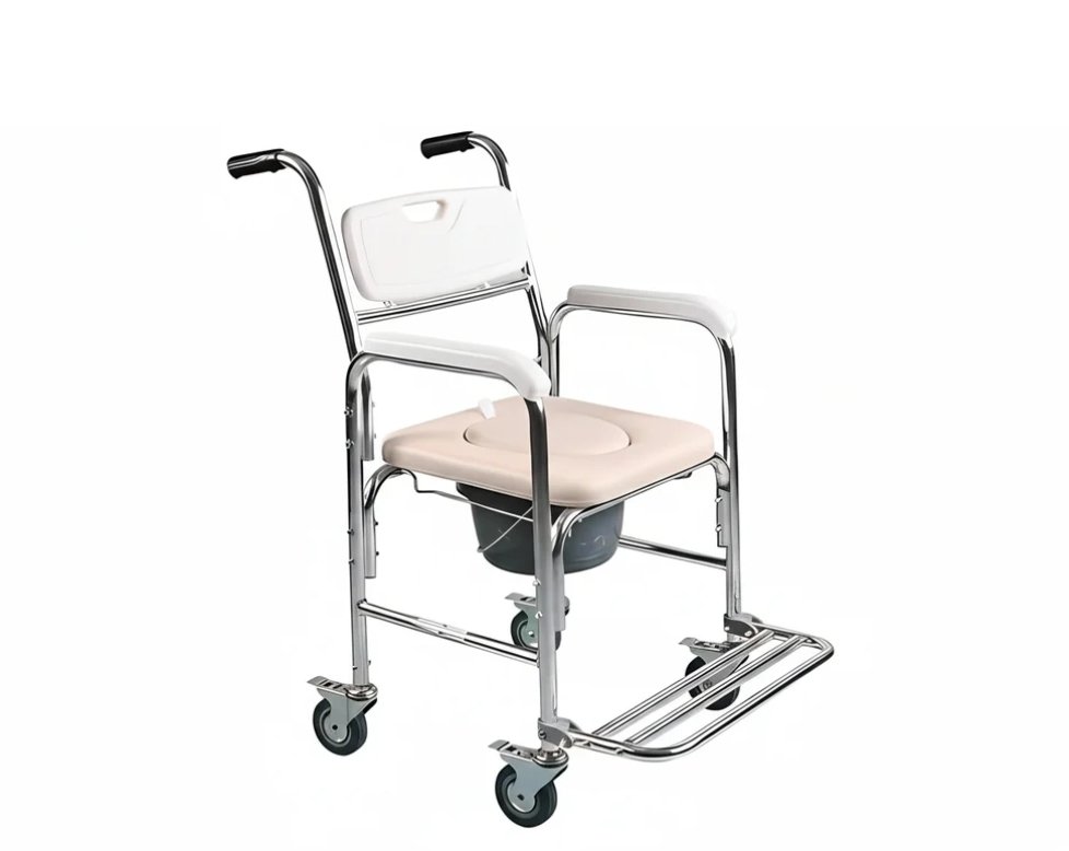 Rolling Commode: Equipped with 4 wheels, all featuring locking brakes. Smooth mobility across carpets, bathrooms, and various floor types.
